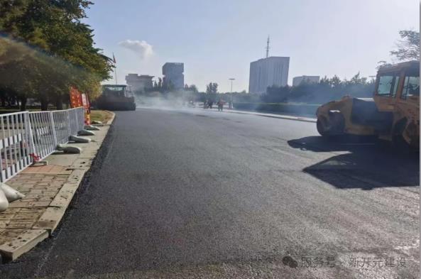 运输车辆载着沥青连续作业,保障原料供应。摊铺机缓缓前行,将沥青均匀铺展在地面,为保证质量,工人们顶着沥青散发的高温,用耙子、刮尺细致修整边角,确保路面与路缘石衔接紧密、平整过渡。紧随其后的压路机来回碾压,从初压的定型到复压的密实,再到终压的收光,每一次滚轮的印记都让路面更加坚实。